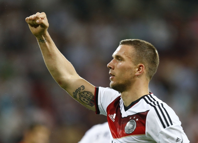 Нападающий сборной Германии Лукас Подольски празднует забитый мяч. / Фото: © Reuters -