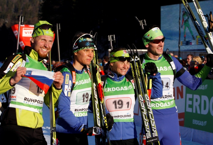Сборная Словении по биатлону финишировала первой в смешанной эстафете на чемпионате мира в Рупольдинге, однако осталась второй в итоговом протоколе. Золото досталось норвежской команде, у которой вычли 30 секунд за то, что у Уле Эйнара Бьорндалена не закрылась одна из мишеней на стрельбе. Сборная России пришла к финишу лишь пятой.