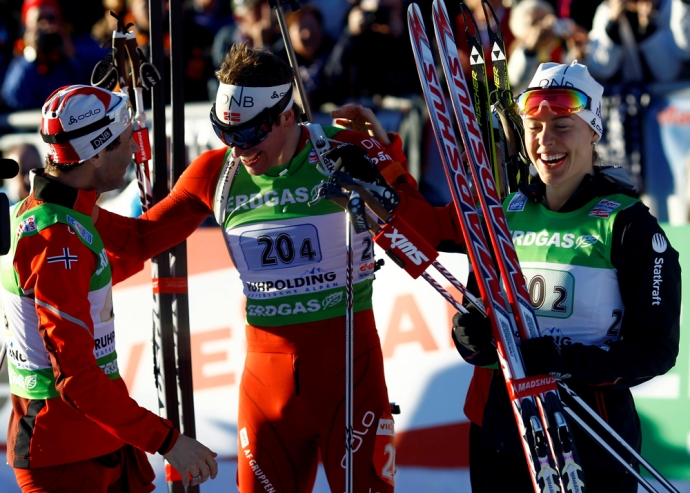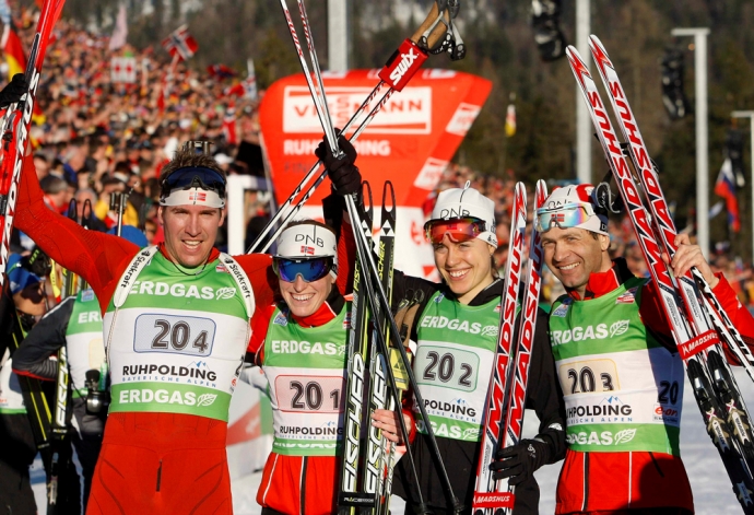 Сборная Норвегии (Эмиль Хегле Свендсен, Тора Бергер, Синнев Солемдаль, Уле Эйнар Бьорндален, слева-направо) - победители смешанyой эстафеты на чемпионата мира по биатлону в Рупольдинге. / Фото: © Reuters