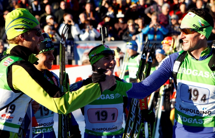 Сборная Словении (Клемен Бауэр, Теа Грегорин, Андреа Мали, Яков Фак, слева-направо) выиграли серебро чемпионата мира в Рупольдинге в смешанной эстафете. Правда, сначала спортсмены думали, что выиграли золото... / Фото: © Reuters -