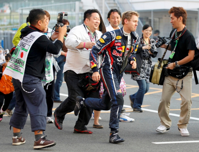 Чемпион мира Себастьян Феттель убегает от преследующих его журналистов и фанатов. / Фото: © Reuters -