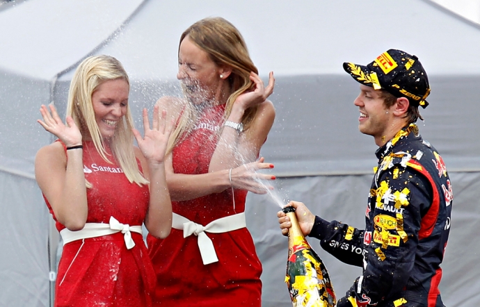 Себастьян Феттель поливает девушек призовым шампанским. / Фото: © Reuters -