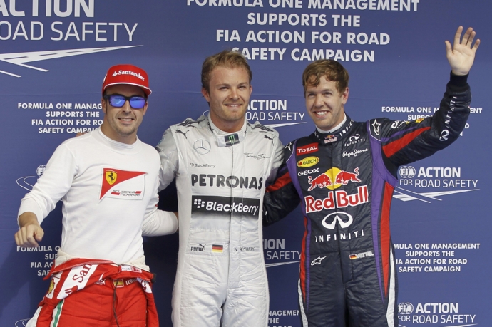 Нико Росберг (в центре), Фернандо Алонсо (слева), Себастьян Феттель. / Фото: © Reuters -