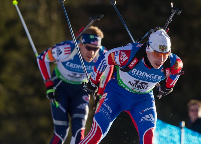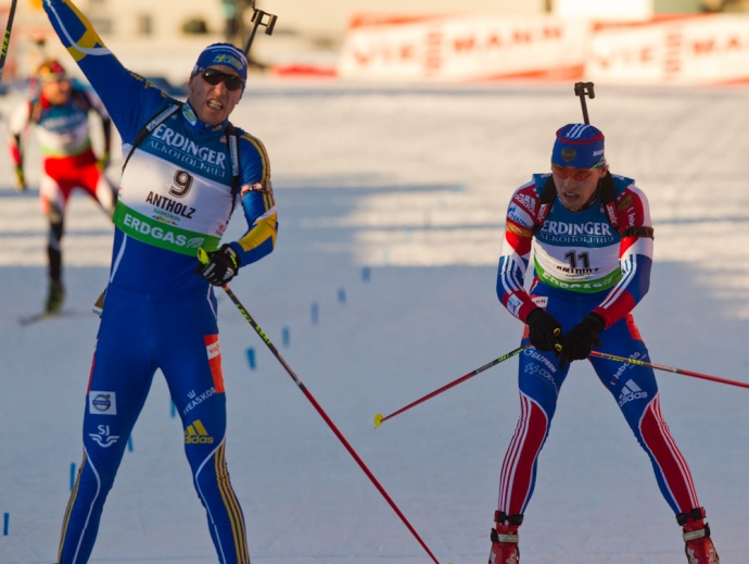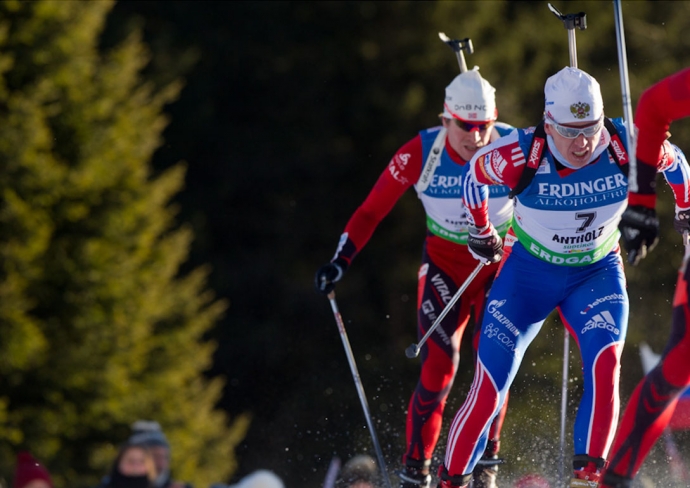 Россиянин Антон Шипулин (справа) в масс-старте Кубка мира по биатлону. / Фото: © Евгений Тумашов/ www.biathlonrus.com -
