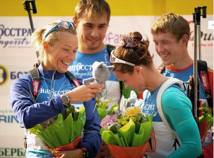 Победители чемпионата мира по летнему биатлону в смешанной эстафете (слева направо): Алексей Волков, Ольга Зайцева, Светлана Слепцова, Антон Шипулин. / Фото: © www.biathlonrus.com -