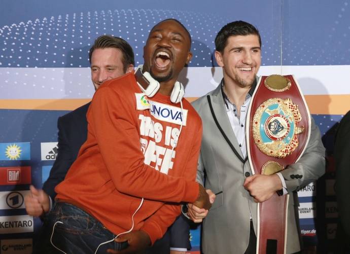 Чемпион WBO немец боснийского происхождения Марко Хук и временный чемпион британец Ола Афолаби. / Фото: © Анна Мискес-Петренко -