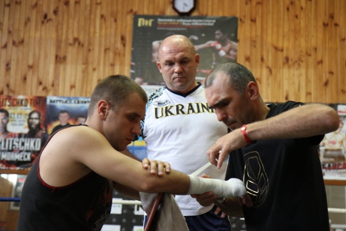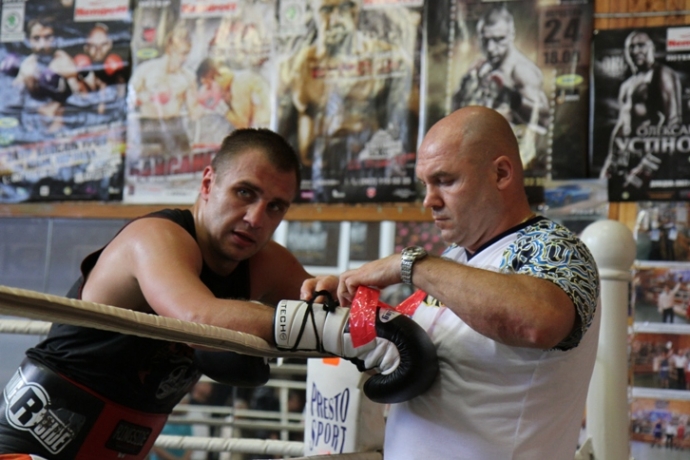 Заслуженный тренер Украины Сергей Гордиенко наблюдает за тренировкой подопечного. / Фото: © Пресс-служба K2 Promotions -