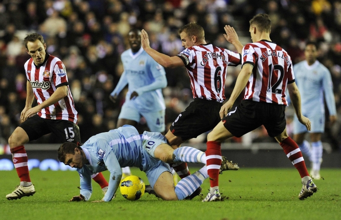 Нападающий "Манчестер Сити" Эдин Джеко (в центре) пытается справиться с обороной "Сандерленда". Итоговый счёт матча 0:1. / Фото: © Reuters -