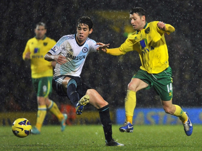 Матч 19-го тура английской премьер-лиги «Норвич» - «Челси» (0:1). Полузащитник «синих» Оскар (слева) пытается убежать от полузащитника «Норвича» Уэсли Хулахэна. / Фото: © Reuters -