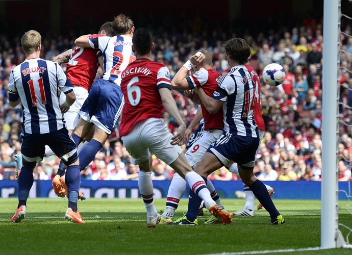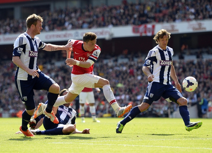 Полузащитник «Арсенала» Месут Озил наносит удар по воротам «Вест Бромвича» в матче 37-го тура чемпионата Англии. / Фото: © Reuters -