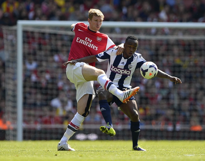 Защитник «Арсенала» Пер Мертезакер (слева) в борьбе за мяч с нападающим «Вест Бромвича» Сэйдо Берахино в матче 37-го тура чемпионата Англии. / Фото: © Reuters -