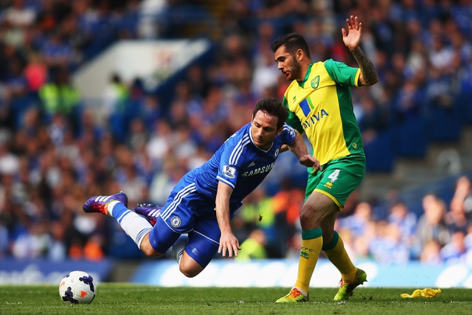 Полузащитники Брэдли Джонсон (справа) из «Норвича» и Фрэнк Лэмпард из «Челси» в матче 37-го тура чемпионата Англии. / Фото: © Getty Images -
