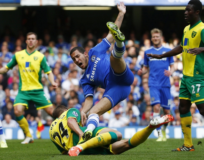 Защитник «Норвича» Райан Беннетт и полузащитник «Челси» Эден Азар в матче 37-го тура чемпионата Англии. / Фото: © Reuters -