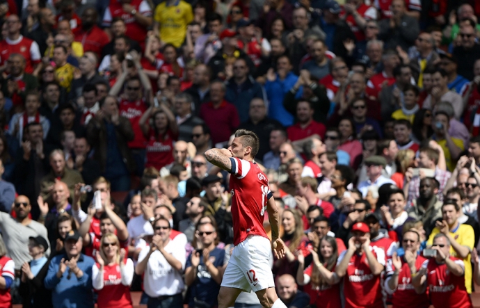 Нападающий «Арсенала» Оливье Жиру забивает победный мяч в ворота «Вест Бромвича» в матче 37-го тура чемпионата Англии. / Фото: © Reuters -