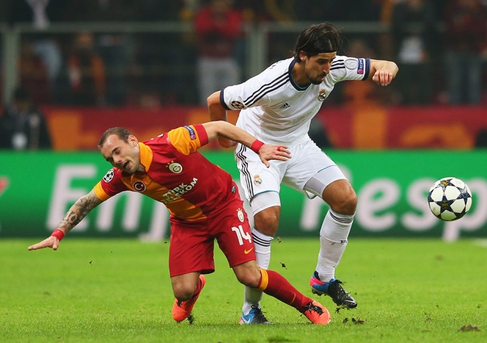 Ответная четвертьфинальная встреча Лиги чемпионов между турецким «Галатасараем» и мадридским «Реалом» (3:2). Борьба за мяч Сами Хедиры и Уэсли Снейдера (справа). / Фото: © Getty Images -