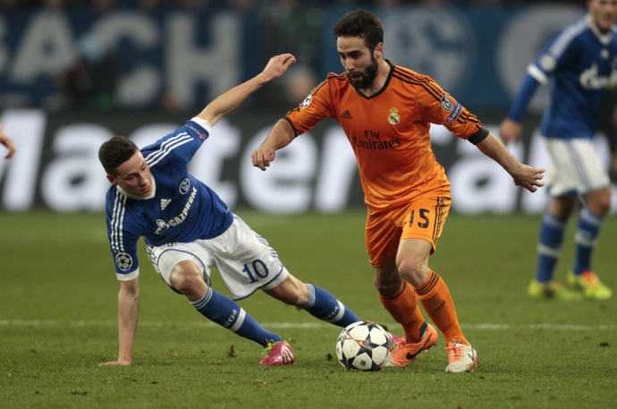 Защитник «Реала» Даниэль Карвахал (№15) обыгрывает полузащитника «Шальке» Юлиана Дракслера. / Фото: © Reuters -