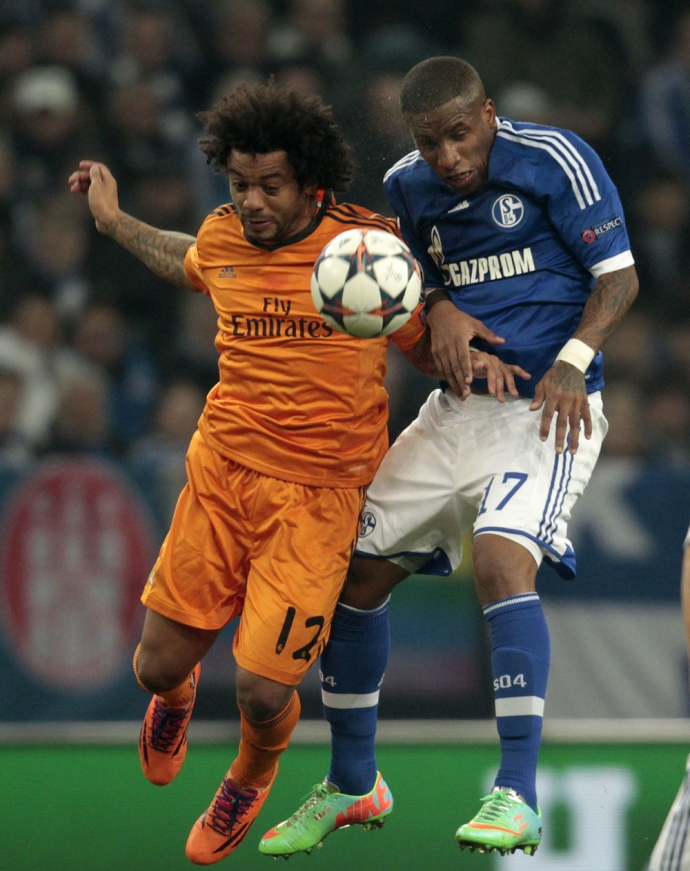 Нападающий «Шальке» Джефферсон Фарфан в борьбе за верховой мяч с защитником «Реала» Марсело (№12). / Фото: © Reuters -