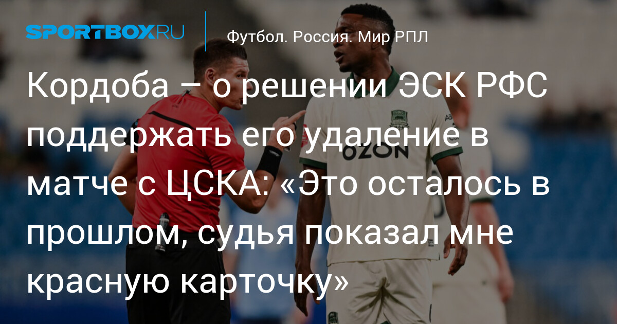 Кордоба – о решении ЭСК РФС поддержать его удаление в матче с ЦСКА: «Это осталось в прошлом, судья показал мне красную карточку»