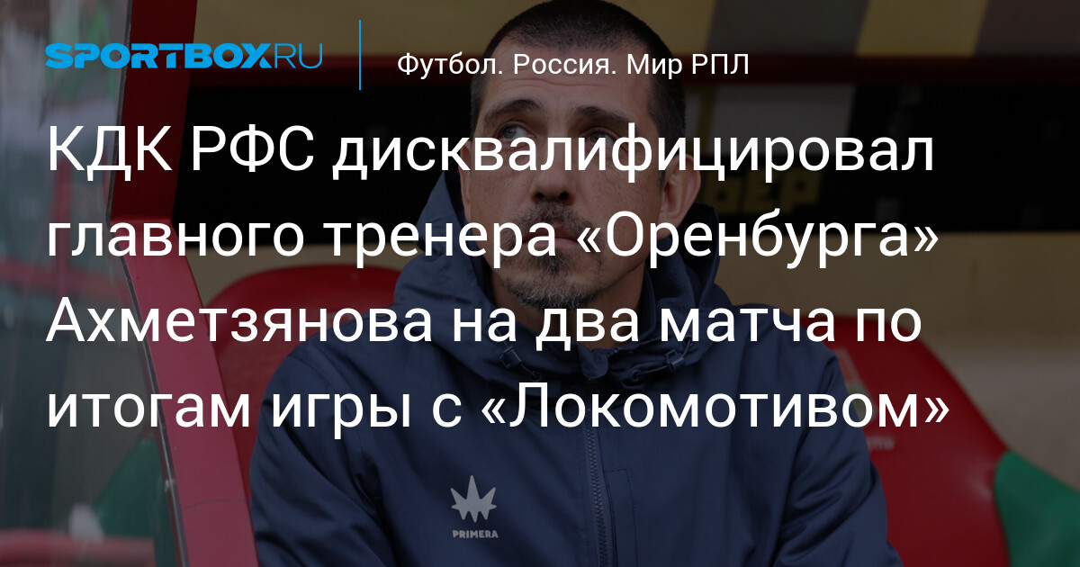 Главный тренер «Оренбурга» Ильдар Ахметзянов дисквалифицирован на два матча после разбора событий игры 15‑го тура МИР РПЛ с московским «Локомотивом», заявил глава контрольно‑дисциплинарного комитета Российского футбольного союза (КДК РФС) Артур Григорьянц.