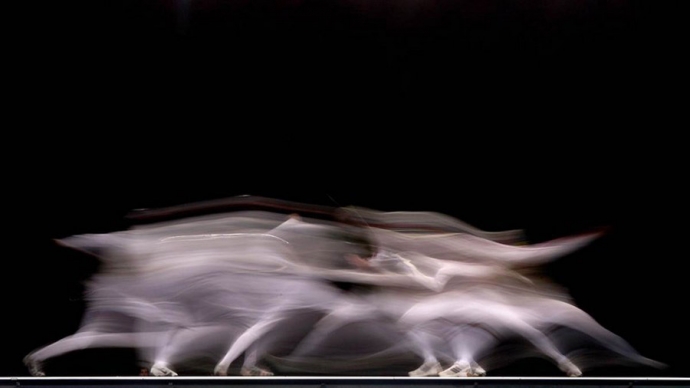 Российский фехтовальщик Алексей Черемисинов и Джейми Кенбер из Великобритании во время командных соревнований на турнире в Лондоне. / Фото: © Reuters -