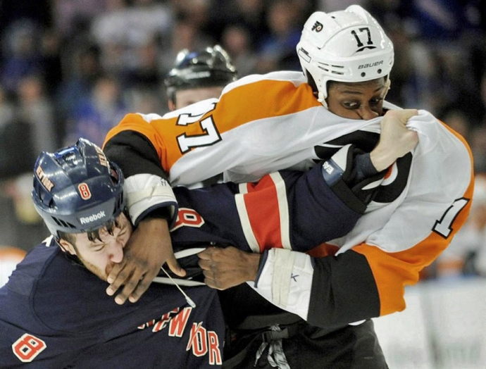 Такой привычный хоккей. В рукопашной сошлись Уэйн Симмондс из «Филадельфия Флайерз» (справа) и Брендон Пруст из «Нью-Йорк Рейнджерс». / Фото: © Reuters -