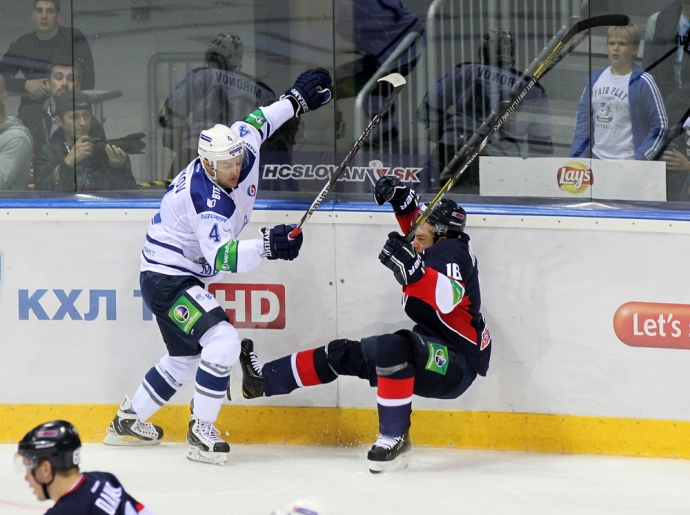 Защитник «Динамо» Александр Бойков (слева) применяет силовой прием против нападающего «Слована» Романа Кукумберга. / Фото: © Мариан Пеигер -