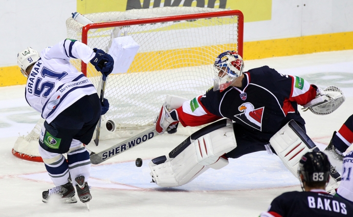 Защитник «Динамо» Максим Соловьёв (слева) отправляет шайбу в ворота Ярослава Януса. / Фото: © Мариан Пеигер -