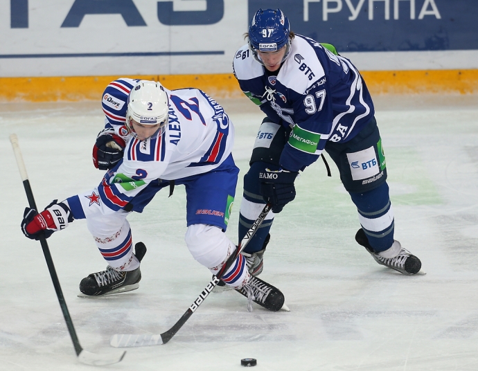 Защитник СКА Юрий Александров (слева) и нападающий «Динамо» Максим Карпов. / Фото: © Василий Пономарев -