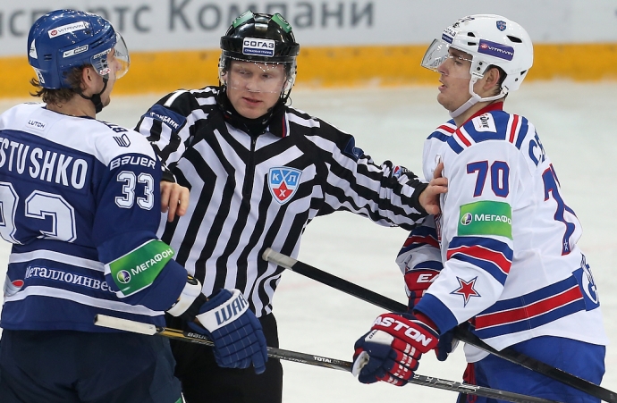 Судье Виктору Гашилову пришлось разнимать нападающих Максима Пестушко (№33) и Романа Червенку (№70) в матче «Динамо» - СКА. / Фото: © Василий Пономарев -