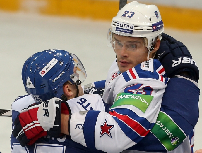 Нападающий «Динамо» Мартиньш Карсумс (слева) и нападающий СКА Алексей Поникаровский в матче регулярного чемпионата КХЛ. / Фото: © Василий Пономарев