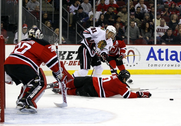 Матч регулярного чемпионата НХЛ «Нью-Джерси» - «Чикаго» - (3:5). Нападающий «Чикаго» Патрик Шарп (№10) забрасывает шайбу в ворота вратаря «Нью-Джерси» Мартена Бродера. / Фото: © Reuters -