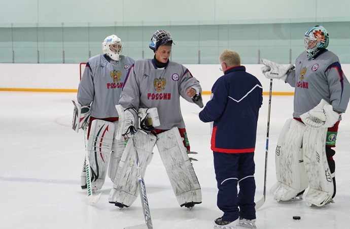 Вратари в полном составе на тренировке молодёжной сборной в Новогорске: Андрей Василевский, Андрей Макаров и Денис Перевозчиков. / Фото: © www.fhr.ru -