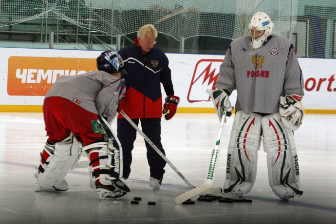 Тренер вратарей Владимир Мышкин со своими подопечными Андреем Макаровым и Андреем Василевским. / Фото: © Динара Кафискина -