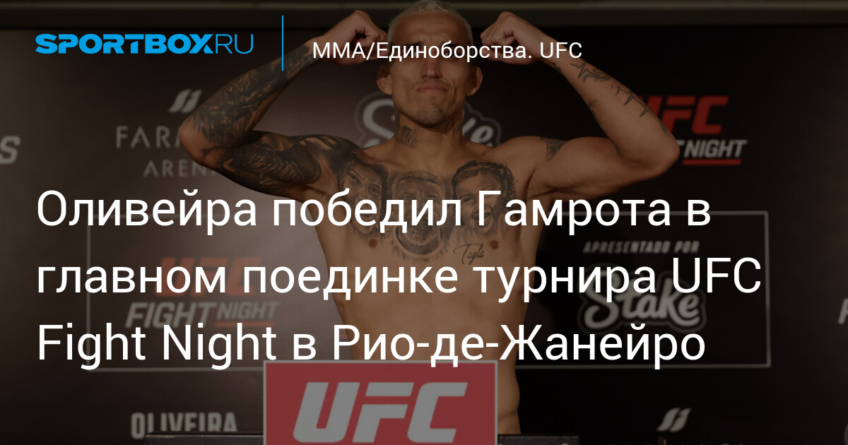 Бразилец Чарльз Оливейра победил поляка Матеуша Гамрота в главном поединке турнира UFC Fight Night в Рио‑де‑Жанейро.