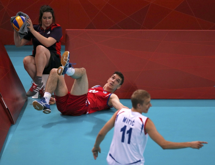 Либеро сборной Сербии по волейболу Никола Росич (в центре). в заключительном матче группового этапа Олимпиады в Лондоне. / Фото: © Reuters