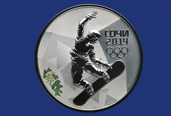Памятная монета из серебра достоинством 3 рубля «Сноуборд-14» по цене 3600 рублей. / Фото: © Оргкомитет «Сочи 2014» -