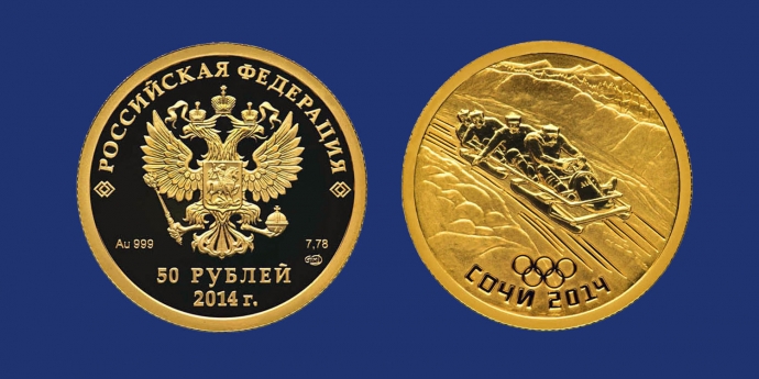 Памятная монета из золота «Бобслей-14» номиналом 50 рублей стоит 19700 рублей. / Фото: © Оргкомитет «Сочи 2014» -