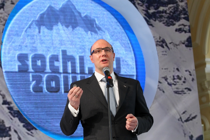 Президент оргкомитета «Сочи-2014» Дмитрий Чернышенко демонстрирует серебряную монету достоинством 3 рубля. / Фото: © Оргкомитет «Сочи 2014» -