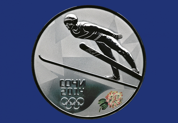 Памятная монета из серебра достоинством 3 рубля «Прыжки на лыжах с трамплина-14» по цене 3600 рублей. / Фото: © Оргкомитет «Сочи 2014» -