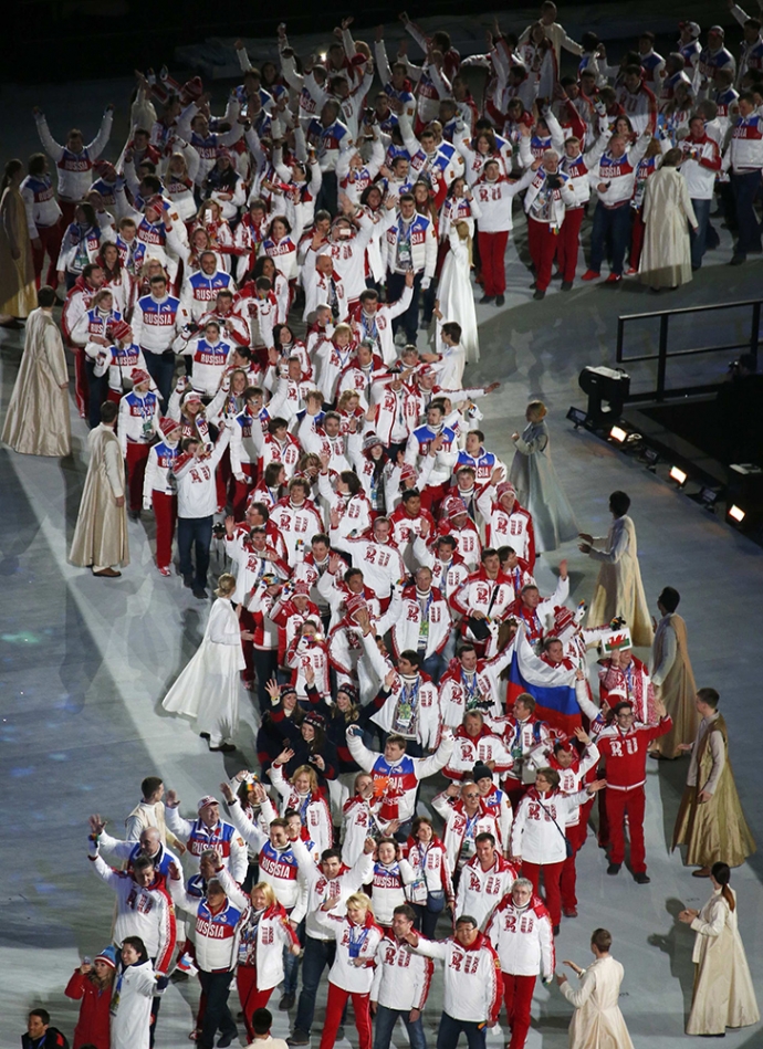 Флаг России выносят олимпийские чемпионы Игр в Сочи. / Фото: © Reuters -